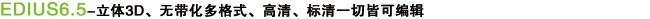EDIUS 6.5除了繼承其一貫的實(shí)時(shí)多格式、順暢混合編輯等優(yōu)點(diǎn)之外,更新增了:立體3D編輯、更多源碼支持、全新的鏡頭穩(wěn)定器、導(dǎo)出Flash F4V等諸多新特性,可滿(mǎn)足越來(lái)越多用戶(hù)對(duì)立體3D、多格式、高清實(shí)時(shí)編輯的各種全新需求。