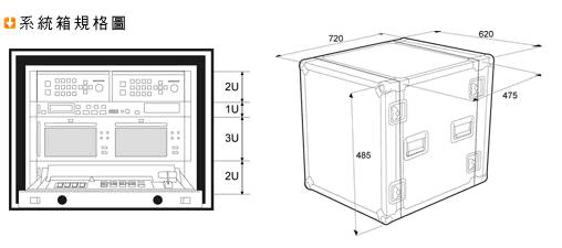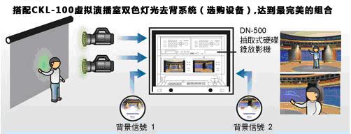 集成配備包括:2臺 DVK-100 影像去背機、SE-500 導播機、抽取式硬盤錄像機、2臺 CP-100 DVD播放器以及 TLM-702 雙7吋液晶監(jiān)視器