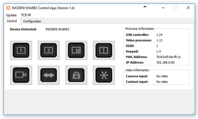 該設備具有自己的應用程序,以便使用USB HID或LAN接口控制Mixer配置。您還可以監控設備上安裝的固件版本以及攝像機和內容輸入的狀態。可以使用更新菜單將設備更新為最新固件。該應用程序的C++源代碼可按需提供。