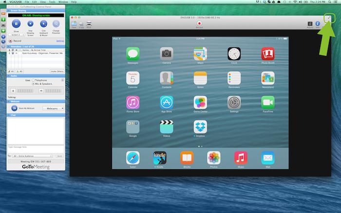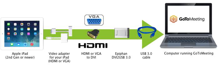 GoToMeeting的高級(jí)版使用戶能夠在同一時(shí)間分享他們的攝像頭和桌面屏幕。使用一個(gè)Epiphan幀或視頻捕獲器,您可以共享一個(gè)iPad屏幕像一個(gè)攝像頭或是“桌面”。