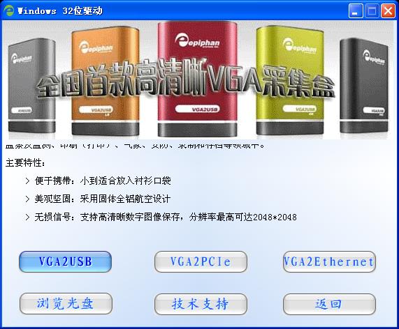 2.    選擇所使用的Epiphan產品,點擊“VGA2USB”安裝驅動程序及Epiphan Capture Tool捕獲工具。