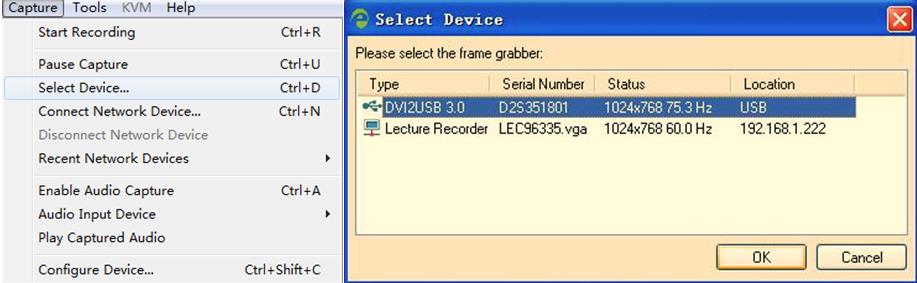4. 若連接有多臺設備,則從“Capture”菜單下點擊“Select Device…”選擇設備,如下圖示