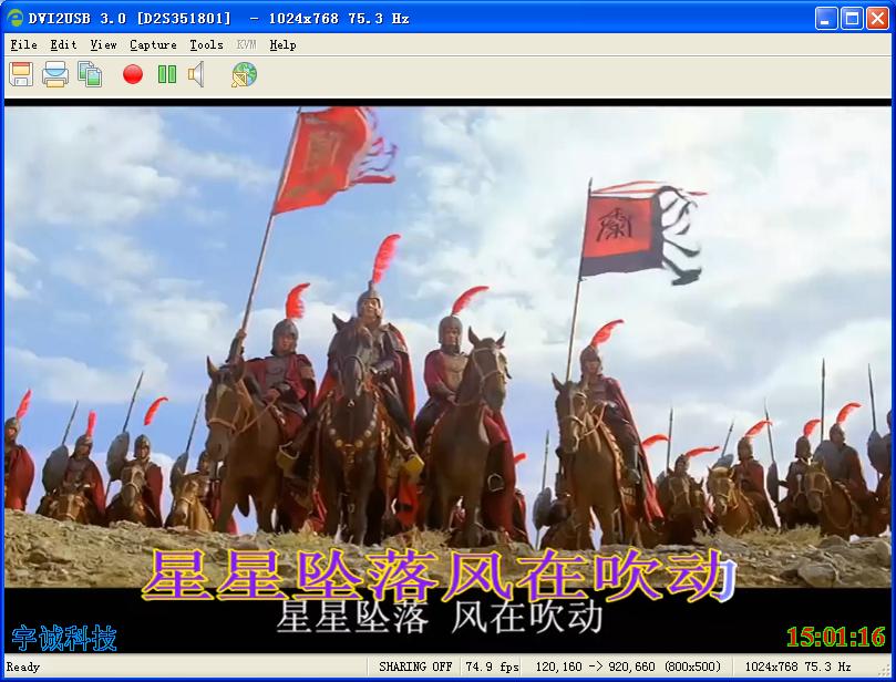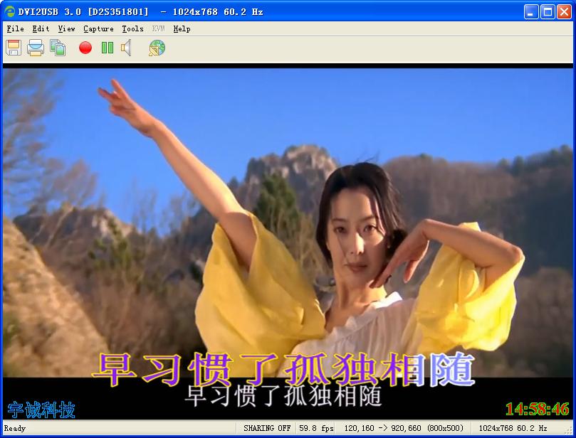 6.    現在就是設置完成后的實時預覽效果,如下圖所示,幀速率達到了59.8fps,采集大小由1024x768剪切為800x500,并在視頻的左下角顯示了自己的文字和右下角顯示了當前的時間。