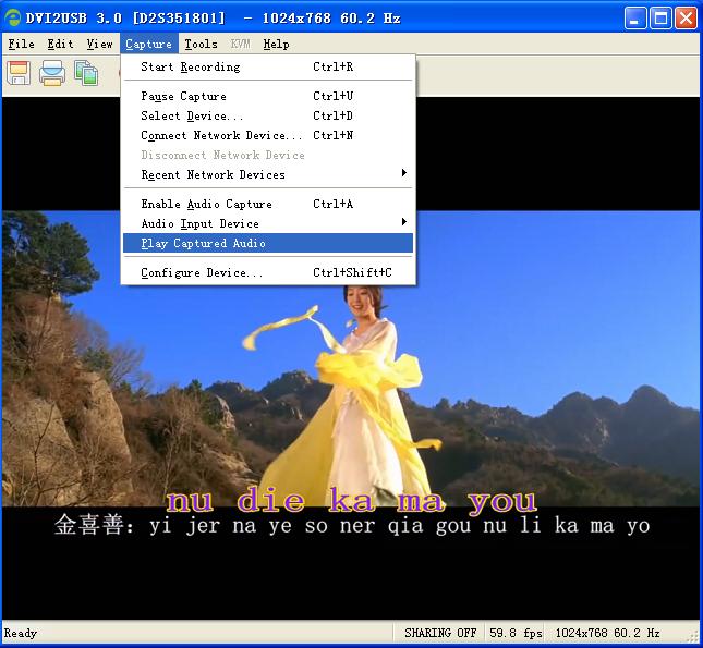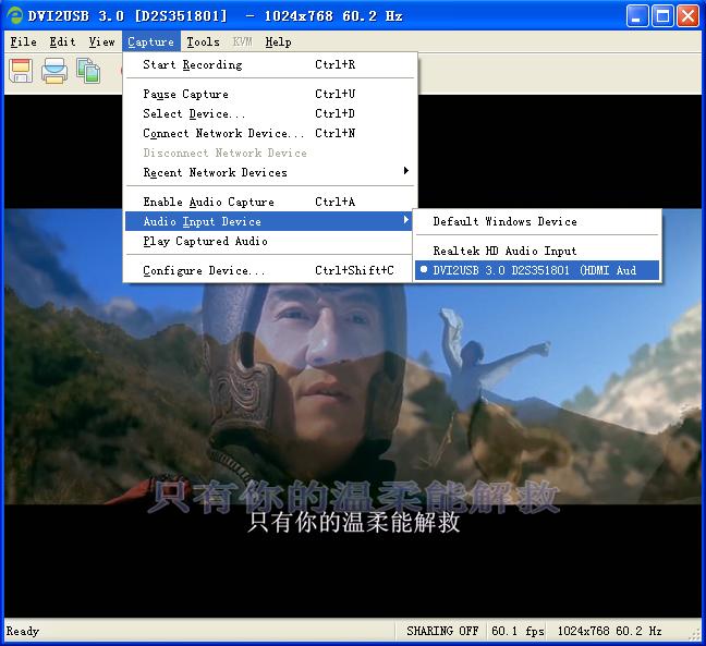 3.    單擊“Capture”菜單下“Audio Input Device”選項,選擇音頻輸入設備為“DVI2USB 3.0……”。