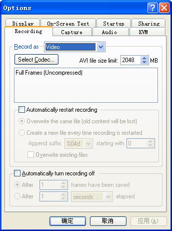 2.    默認打開“Recording”選項設置窗口,在“Record as”項后的下拉菜單中選擇要采集成Video視頻還是Image圖片序列,點擊“Select Codec…”選擇編碼器(若系統中裝有其它編碼插件,則可在此項中選擇應用,默認無壓縮文件會特別大)。