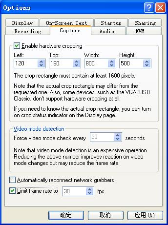 4.    若只想采集信號中的某一區域視頻,則可在“Capture”選項中將“Enable hardware cropping”勾選并設置相應參數即可,更下端的“Limit frame rate to 30 fps”是將視頻幀速率限定到了30fps,取消后將不受限制進行采集。