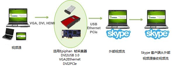 Epiphan客戶可以在Skype通話期間加入和視頻流,使用Epiphan幀采集器和Skype的視頻編碼功能將流視頻源從一個Skype用戶傳到其他Skype用戶,如上圖所示。