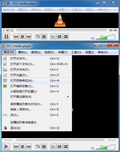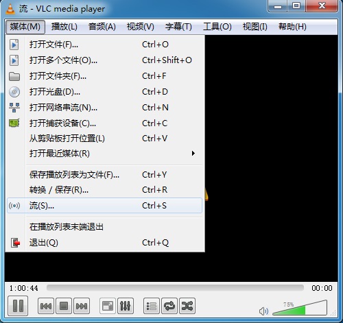 1. 打開VLC播放器,選擇 “媒體”菜單下的“流(S)…”