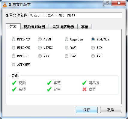 8. 點擊后方的配置按鈕進行參數配置,可選擇封裝的格式及視音頻碼率等參數設置,如下所示。