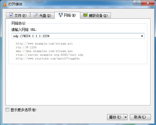 11.在“網絡”選項下的網絡協議中輸入URL地址,即上述中的UDP組播地址,注意協議格式