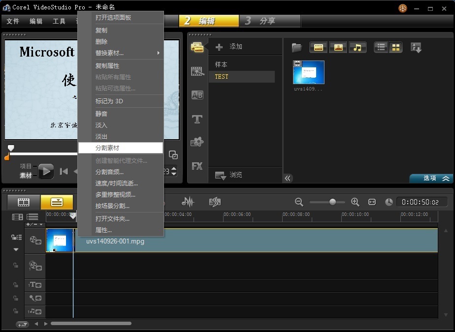 6.    若要將素材刪除其中的某一段,則在時間線上的素材上點右鍵選擇“分割素材”,可將素材分段。
