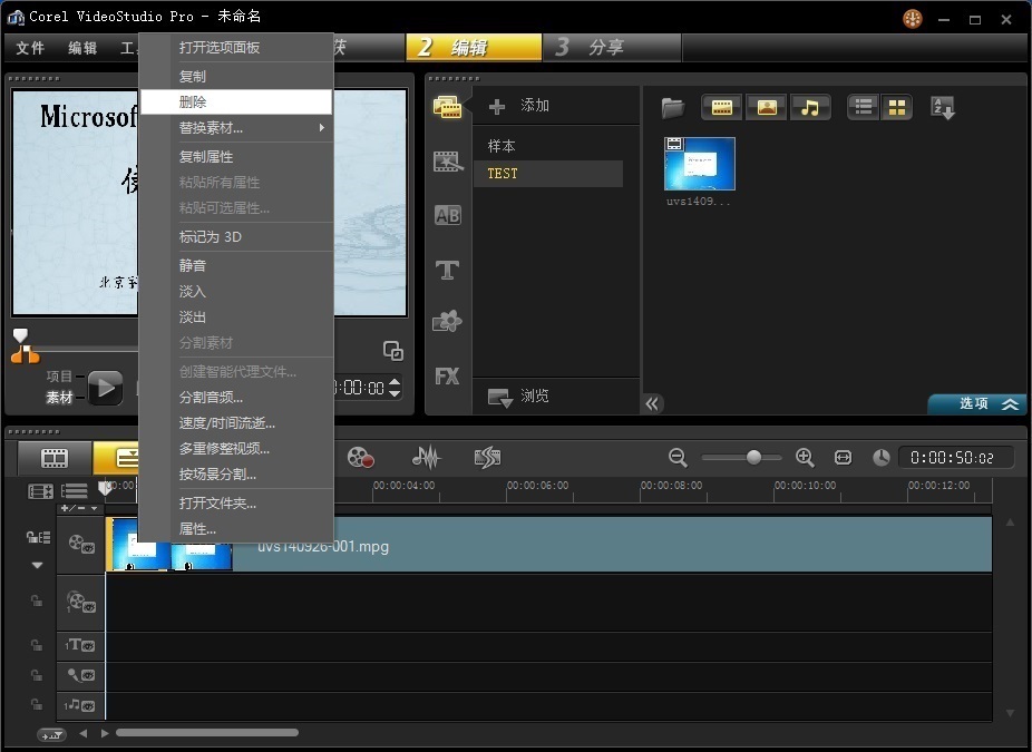 7.    再選中要刪除的素材,點右鍵選擇“刪除”即可將該段素材刪掉。