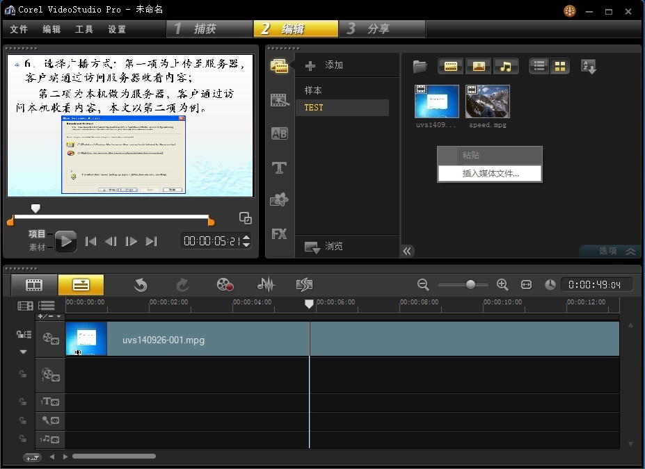8.    在右側(cè)素材庫的空白處點擊右鍵,選擇“插入媒體文件…”可將電腦中的其它媒體文件導入。