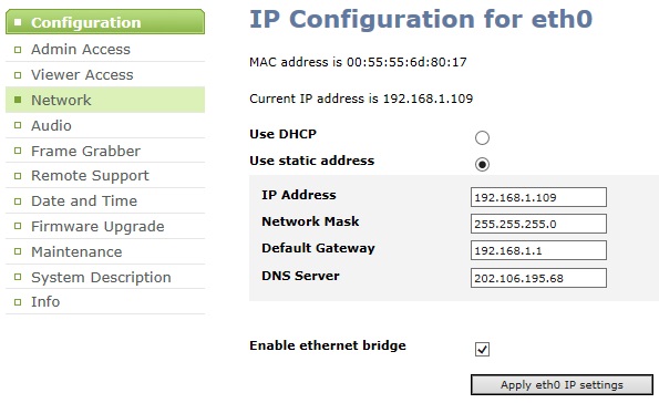 3.  點擊左側菜單欄中的“Network”,設置為固定IP地址及相關參數,點擊“Apply eth0 IP Settings”保存設置,重啟即可生效;若啟動網橋功能則勾選“Enable Ethernet bridge”,此時再將電腦的IP改回局域網中,電腦即可通過Ethernet的Eth2口上網。