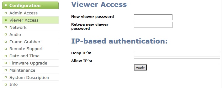 5.  在WEB管理的“Viewer Access”菜單項中,可設置禁止或充許訪問的客戶端IP,或設置訪問者的密碼。