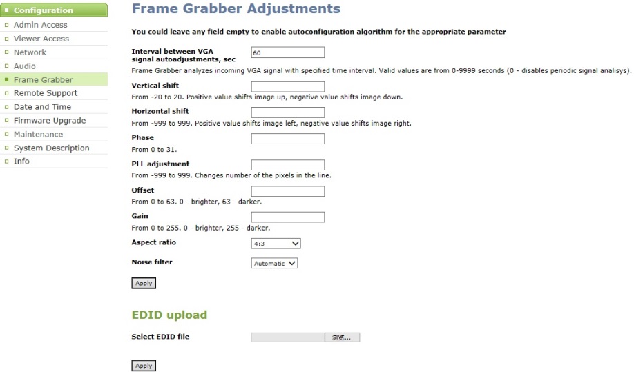 7.  在“Frame Grabber”菜單項中可設置圖像的偏移、及色彩的增益和寬高比。