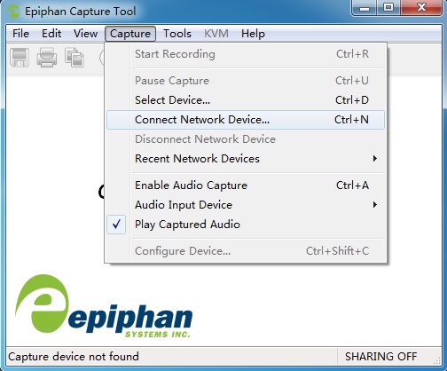 9.  打開自帶軟件“Epiphan Capture Tool”,點擊“Capture”-“Connect Network Device…”連接網絡設備。