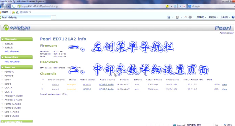 接下來我們將設備加電并將網絡接通,然后在IE瀏覽器中輸入Pearl的IP地址(可在前面板LCD液晶屏的系統狀態中查看到IP地址),輸入用戶名“admin”,密碼為空,登陸進入它的WEB管理界面,首先看到的是設備的狀態信息頁面。管理界面主要有兩大部分組成:一、左側菜單導航欄;二、中部參數詳細設置頁面。