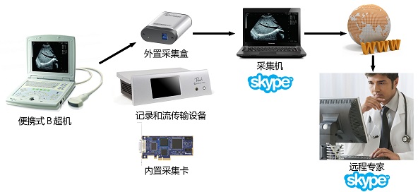 便攜式B超機(jī)是遠(yuǎn)程戶(hù)外救援隊(duì)的一個(gè)非常關(guān)鍵的工具,如果是專(zhuān)家親臨現(xiàn)場(chǎng),可以極為方便的查看病情,但有些專(zhuān)家并非有時(shí)間能親臨救護(hù)現(xiàn)場(chǎng),于是當(dāng)現(xiàn)場(chǎng)的救護(hù)人員請(qǐng)求在醫(yī)院或是其它地方專(zhuān)家指導(dǎo)操作時(shí),能看到現(xiàn)場(chǎng)病人的實(shí)際情況就成了非常重要的關(guān)鍵。現(xiàn)場(chǎng)救護(hù)人員可以攜帶著便攜式的艾普飛產(chǎn)品,然后將B超機(jī)的圖像輸出到艾普飛設(shè)備,后再將其連接到可以上網(wǎng)的筆記本電腦,即可通過(guò)skype或QQ等網(wǎng)絡(luò)聊天工具調(diào)用,這樣遠(yuǎn)程的專(zhuān)家就會(huì)像身臨其境般的看到病人的病情并加以指導(dǎo)。