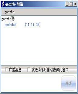 在即時消息系統中,您可以方便的和其他人員進行文字交流,您也可以通過對組的右鍵菜單“添加”、“刪除”、“重命名”,并通過人員拖拉的方式來建立您自己的即時消息用戶列表。用戶可以指定與其他用戶進行文字聊天。支持“群發消息”, “廣播消息”和“發送后自動隱藏”選項。如下圖: