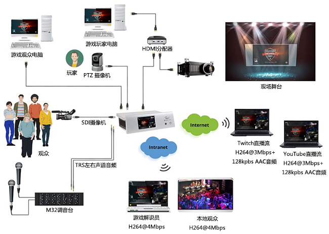 用單臺艾普飛Pearl將游戲日現場活動同時流傳輸送給Twitch,YouTube,游戲解說員及現場大屏。